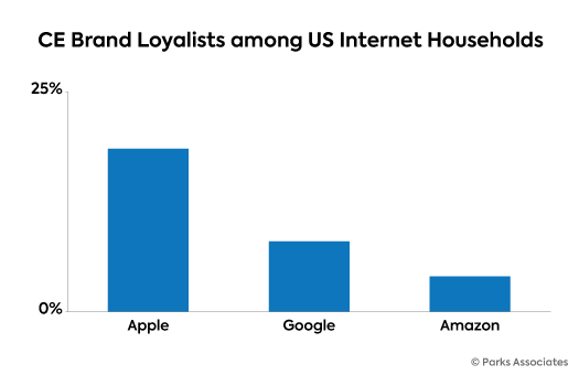 Parks Associates’ new research from its quarterly survey of 10,000 internet households shows that Apple is leading the ecosystem among connected consumers, with nearly 20% of US internet households owning three or more Apple-brand device types. The research study Quantifying Brand Loyalty: Connected Device and Platform Ecosystems evaluates the devices and ecosystems developed by the four leading brands among consumer devices: Apple, Amazon, Google, and Samsung.