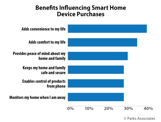 A new white paper from Parks Associates, Value Beyond Home Security: Expanding Product Ecosystems, finds “peace of mind” is a key driver for smart home adoption, with 31% of recent buyers citing this factor as a top benefit influencing their purchase. The whitepaper, developed in partnership with Alarm.com, finds consumers are increasingly reliant on connected devices and security services to deliver peace of mind in and around their home, driving the expansion of professional services beyond home security.