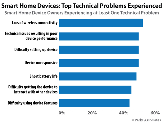 Consumers report the main reason for smart home returns were “the product did not work as advertised” and they had “difficulty with the physical installation,” indicating more work needs to be done to improve consumer education, setup and installation processes, and product connectivity. Additionally, over one-half of Wi-Fi network owners report some network problem over the last 12 months, including slow speeds and lost connections.
