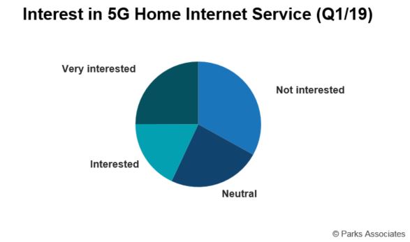 However, consumer 5G awareness remains low as mobile service providers have just recently begun to market their 5G rollouts. Recent Parks Associates research reports than almost 50% of US broadband households are unfamiliar with 5G. Widening service availability and accompanying marketing programs will significantly raise awareness levels over the next few years. After being provided a description of 5G services, close to half of broadband households surveyed expressed interest in replacing their fixed line internet service with 5G home services.