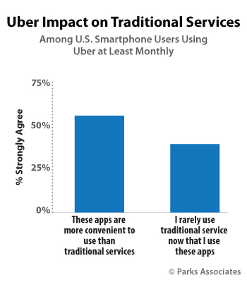 - 37% of monthly Uber users report that they rarely use traditional services now that they use ride-sharing apps. Should an Uber air transport be successful, short-range airline routes would almost certainly impacted. It would not replace car-based travel in the United States, though it could relieve some road congestion.