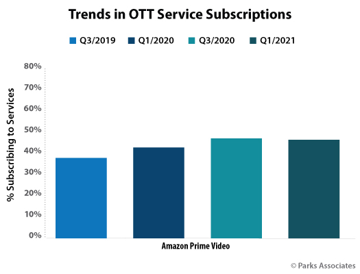 Despite the uptick in overall OTT subscriptions over the past year, Prime Video’s growth has flatlined. Data from Parks Associates indicates that subscriptions among broadband households have remained stagnant at 47% between Q3 2020 and Q1 2021.