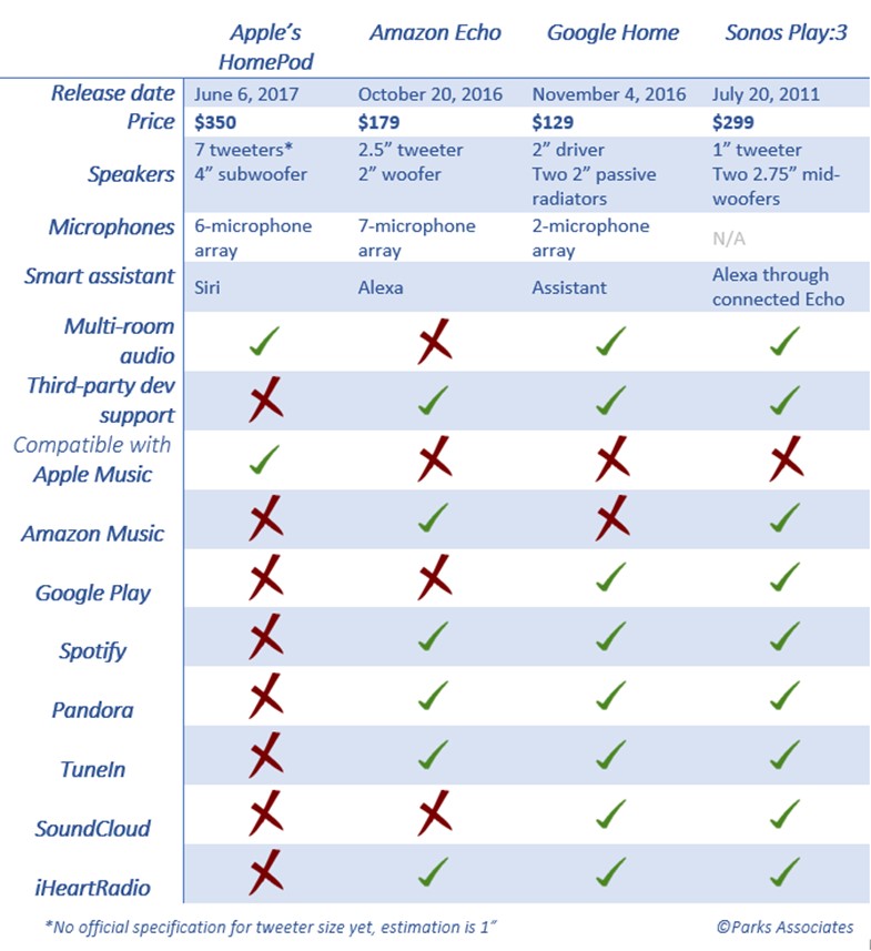 Today is Amazon’s Prime Day (7/11). In the past week, noteworthy discounts on Amazon’s Alexa-powered devices has been top tech news. As of Q2/2017, Amazon’s smart speakers with the Alexa personal assistant have led smart speaker market with highest consumer adoptions (according to data from Parks Associates). During its WWDC17 keynote, Apple announced its participation in the playground with Apple HomePod, which will be ready to ship in December 2017, suggesting a coming change in market dynamic. Positioned as the smart speaker with high-end sound quality, HomePod promises a more complete experience to smart speakers where the device is not just a “home for personal assistant and also a speaker” but a sound system that is smart.