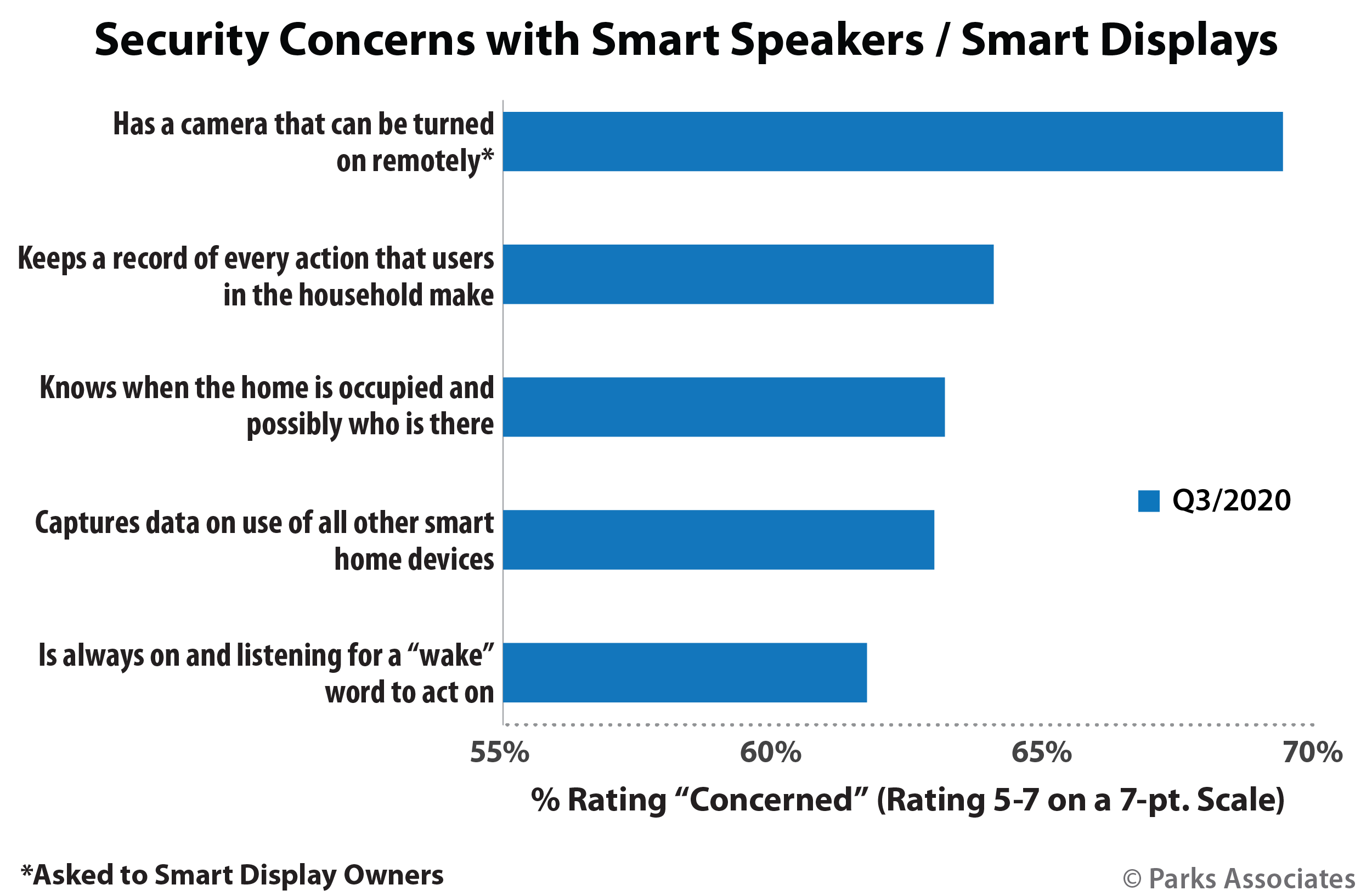 -          63% of smart speaker and smart display owners are concerned that the device may keep a record of every action that users in the household make; the same percentage are concerned that the device knows when the home is occupied and possibly who is there. (Smart Speaker, Smart Display Market Assessment)