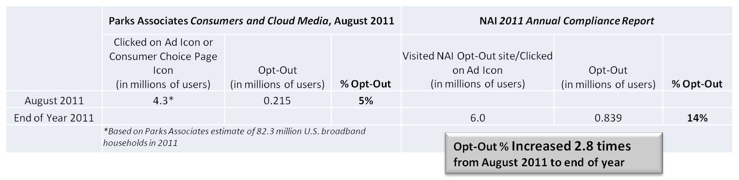 ...and do they care enough to take action? The Network Advertising Initiative (NAI) recently published findings on online behavioral advertising (OBA) awareness and opt-out levels. In August 2011, Parks Associates tested recall and response rates to self-regulatory efforts giving consumers the option to opt-out of OBA. In review of the NAI’s findings, Parks Associates decided to compare their data to ours with aim to uncover changes in consumer behavior from mid-year to end of year 2011.