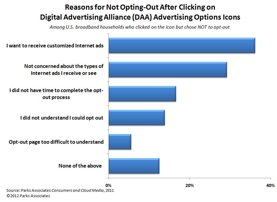 While the online industry supports self-regulatory efforts, the following data gives pause to industry initiatives to allow consumers to block personalized advertising campaigns. Over-one third of online users state that after clicking the icon they chose not to opt-out. Why? Get this - they want to receive ads that are customized to their product or service preference. What a novel idea. In addition, nearly one-third are simply do not care enough about the types of Internet ads they see to do so.