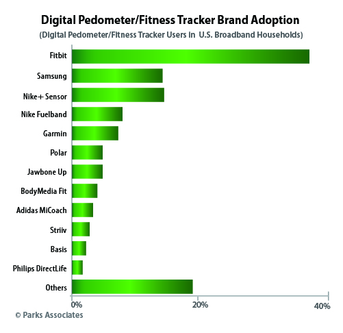 Fitbit is the early leader in the market for digital fitness trackers with nearly 40% of the market, according to new research Parks Associates announced today in advance of the firm’s Connected Health Summit: Engaging Consumers, September 4-5 in San Diego, California. The 2Q 2014 survey of more than 5,000 U.S. broadband households found that Fitbit is far ahead of its closest competitors Samsung (14%), Nike+ Sensor (14%), and Nike Fuelband (8%).