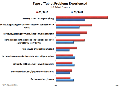 Parks Associates research predicts that comprehensive technical support will remain the most relevant service as the market continues to grow and evolve. Published in the firm's 4Q 2013 research report, The Evolution of Tech Support: Trends and Outlooks, analysts find that 55% of smartphone owners want a service that protects their device from viruses and identity theft, and approximately 50% want a service that repairs or replaces their device if accidentally damaged. Short battery life and establishing a network connection remain the two most common problems on smartphones, but the firm's research reveals consumers find value in comprehensive support, rather than one-time fixes.