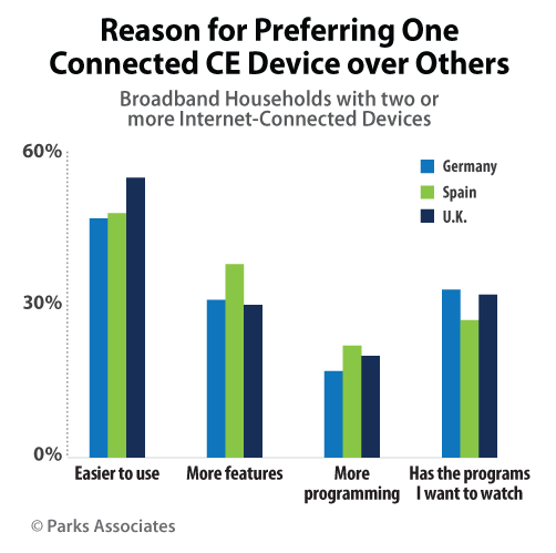 The research firm also recently announced new European data showing 50% of U.K., Spanish, and German broadband households with multiple connected CE select their preferred device based on ease-of-use, and not on availability of content or specific device features.