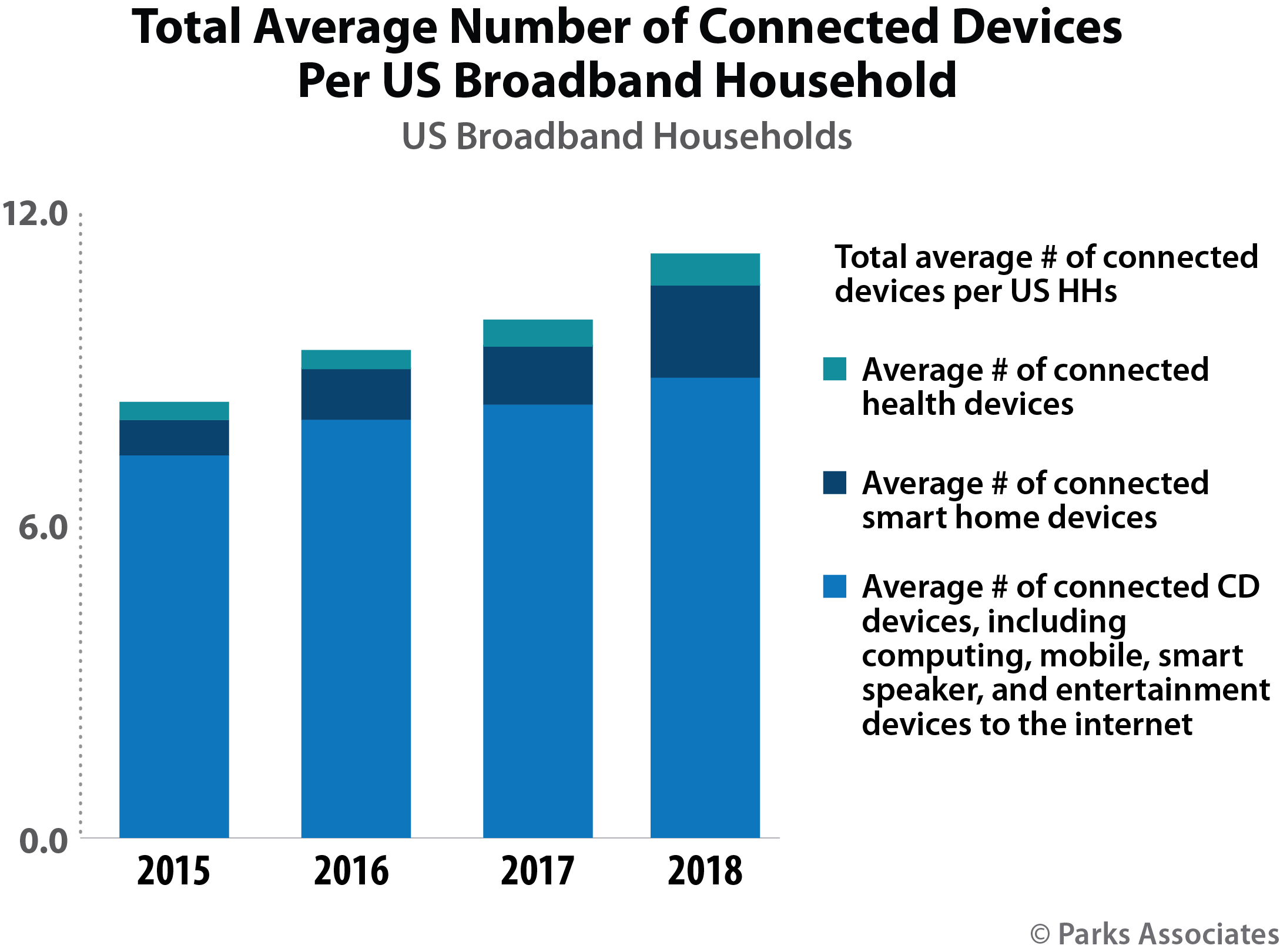 The number of connected devices continues to expand year-over-year, and 2019 concluded on a particularly strong note for the security industry. Security system adoption reached one-third of all US broadband households at the end of the year. Consumers now have an average of 12 connected devices in their homes, which opens multiple opportunities to extend monitoring services as well as different varieties of both professional monitoring and monitor-it-yourself options.