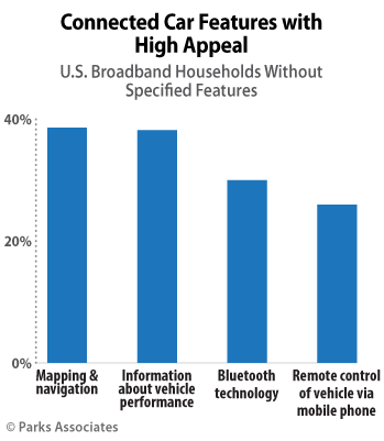 In the first quarter of 2015, Parks Associates surveyed U.S. vehicle owners living in broadband households regarding their familiarity with and use of various connected car and connected home services. The results indicate that American drivers are using a variety of connected features in their vehicles, and some express interest in car-to-home crossover features. Parks Associates forecasts that there will be 41 million active Internet connections in U.S. vehicles by the end of 2015. At the same time, one-third of U.S. broadband households plan to purchase a smart device this year. These ecosystems are growing in parallel and opportunities for cross-over features and services are beginning to emerge.