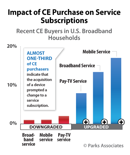 Parks Associates research shows, despite cord-cutting fears inspired by connected CE and OTT video, pay-TV adoption rates are holding steady. In the U.S., 90% of OTT service subscribers also subscribe to a pay-TV service. Furthermore, pay-TV adoption is higher among connected CE owners than among those without; 97% of U.S. broadband households with three or more connected CE devices have a subscription.