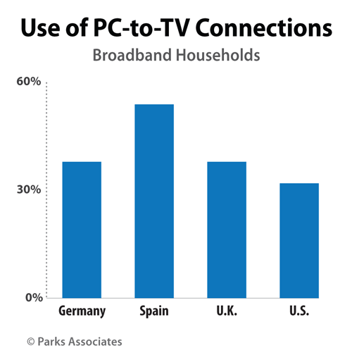 Parks Associates today announced new European research that shows that the growth of broadband and OTT services is fundamentally changing the European video industry. The data reveals adoption of PC-to-TV connections in Europe exceeds that of adoption in the U.S: among broadband households, 54% in Spain and 38% in the U.K. and Germany have a PC connected to the TV, compared to just 32% in the U.S.
