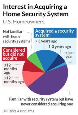 In a recent survey of 5,000 U.S. broadband households, Parks Associates finds that almost 50% of consumers are familiar with home security systems but have not previously considered purchasing or otherwise acquiring one. The same survey also reveals that security dealers have growing optimism for security sales as they combine their offerings with smart home options.