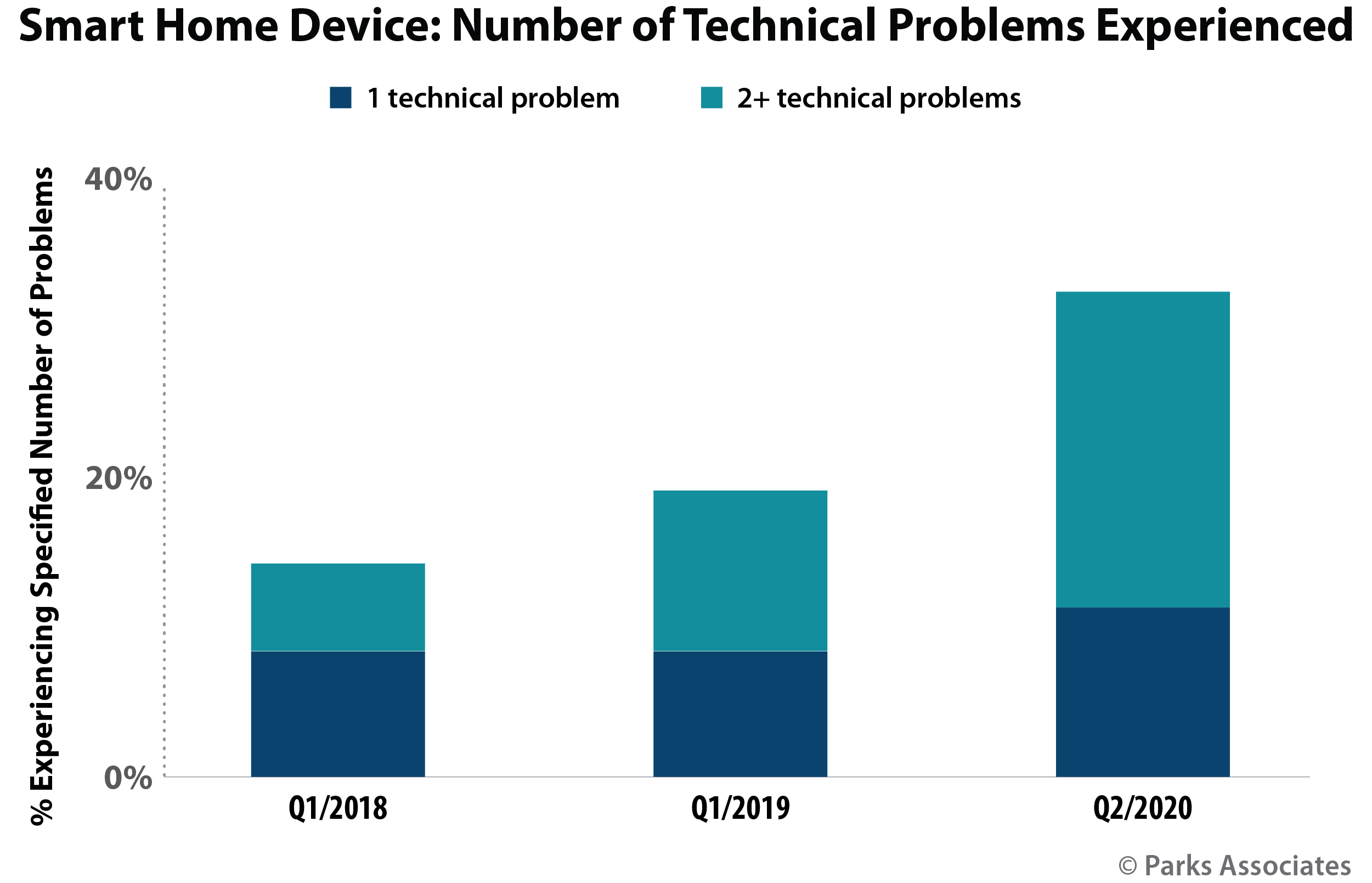 A growing percentage of smart home device owners now experience multiple problems with their devices each year, and within the last twelve months, one-third of smart home device owners report experiencing technical problems. Many of these issues stem from problems with wireless connectivity which disrupts a device’s ability to communicate with the home network. Additionally, some households report interruptions with the broadband provider’s service due to the increasing strain on the home network caused by the addition of multiple devices and increased bandwidth demand for video streaming.