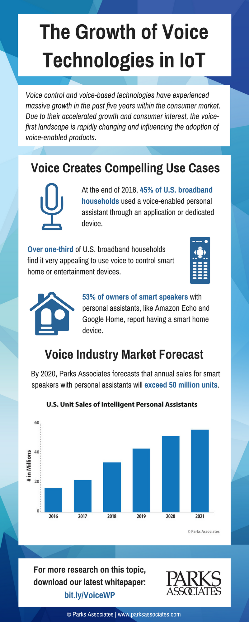 The infographic below summarizes the market potential for this emerging technology category. For more information on the rise of voice control in the smart home, download a copy of Parks Associates' latest whitepaper, Impact of Voice on Connected Consumer Markets.