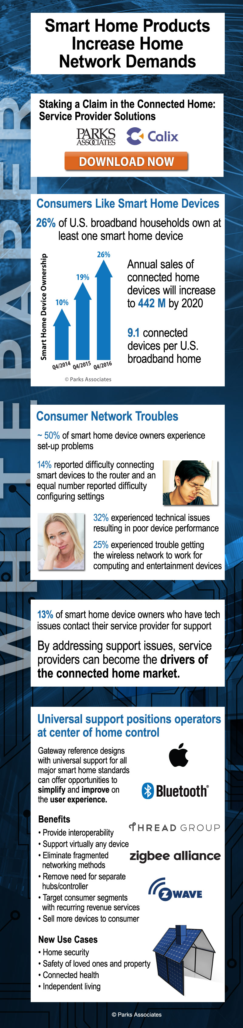In the infographic below, Parks Associates highlights some of the key findings from its latest whitepaper, sponsored by Calix, Staking a Claim in the Connected Home: Service Provider Solutions. Download your copy today!