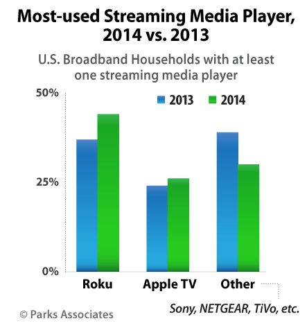 Parks Associates announced a new report today showing that more than 25% of U.S. households will have a streaming media player by 2015, with continued robust sales and new entries such as Amazon Fire TV driving expansion of this connected CE category. The report, The Evolving Market For Streaming Media Devices,found Roku accounted for nearly one-half of streaming media players (46%) purchased in the U.S. in 2013, while Apple, its closest competitor, had 26%.