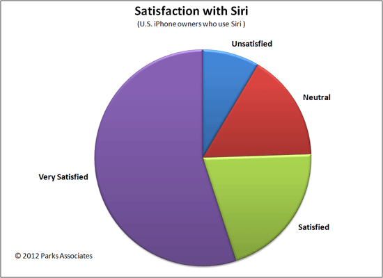 55% of U.S. users of Apple iPhone 4S are “very satisfied” with the Siri voice-command feature, according to new consumer research from the international research firm Parks Associates. The survey, featured in Apple iPhone Siri Users, finds an additional 21% are “satisfied” which totals over three quarters or 76% satisfied, leaving a small number of dissatisfied users. Thirty-seven percent of iPhone 4S owners also want to have a similar voice-command interface for their TV set, and roughly 20% would not.