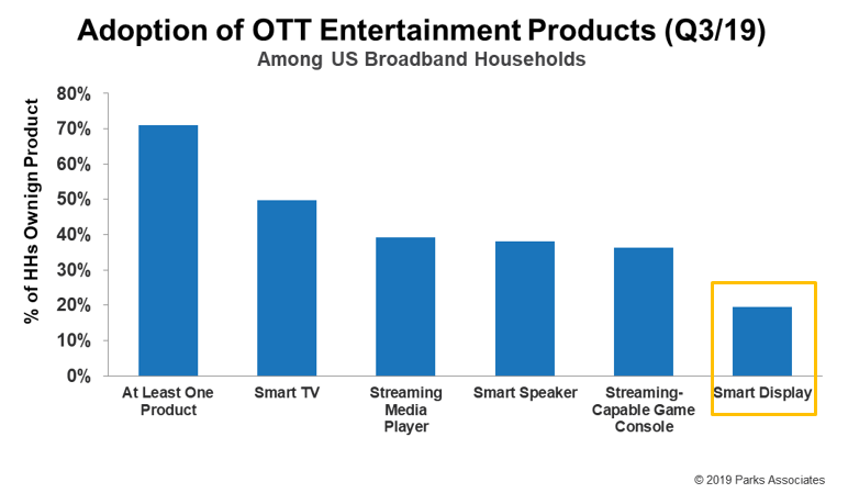 The newest category of screened in-home device to emerge is the smart display. While primarily aimed at being the control hub for smart home equipment, smart displays are also a streaming video platform. At present, one-in-five US broadband households own a smart display.