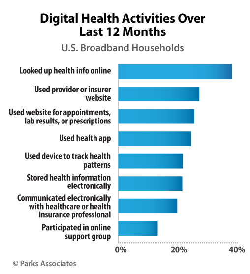 In the last 12 months, 38% of consumers in U.S. broadband households looked up health information online, and 27% used the website of their care provider or insurer, according to research from Parks Associates.