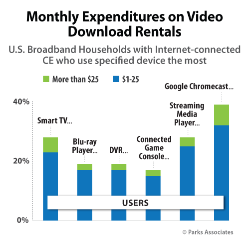 “Among frequent smart TV users, nearly 30% download video rentals, while 40% of users who favor the Google Chromecast rent video downloads each month,” Kraus said. "There is a core set of users for all CE devices who are paying for video rentals and purchases. Ease-of-use is the key factor driving most households to use a certain device, so developing a rental or download content service that is simple and well integrated with a device's UI could help increase a la carte revenues among streaming content."