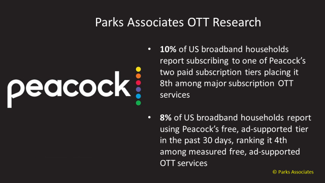 The launch of NBCUniversal’s OTT streaming service Peacock last year was hampered by its unavailability on key leading platforms. Parks Associates data from our OTT research shows Peacock’s position: