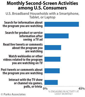 New digital media research from Parks Associates finds 65% of U.S. broadband households engage in at least one second-second screen activity on at least a monthly basis. 360 View Update: Second-Screen Usage Patterns finds the most common activity is to search for information about the program being watched.