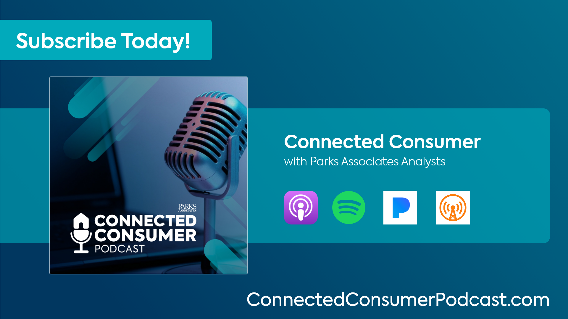 The Connected Consumer podcast is available on multiple podcast platforms, including Apple, Spotify, Pandora, and Audible. To request data or an interview, contact Rosey Ulpino at rosey@parksassociates.com, 972.996.0233.