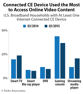New connected CE research from Parks Associates finds a steadily increasing number of U.S. broadband households are turning to a streaming media player first when looking for online content. Currently, 21% of U.S. broadband households with at least one Internet-connected CE device use a streaming media player as the primary platform for online video, up from 12% a year ago. By comparison, streaming video usage declined for both connected gaming consoles and DVRs and increased modestly for smart TVs.