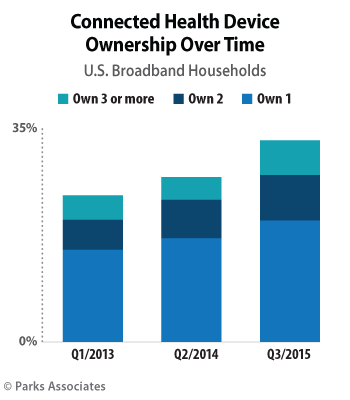 Parks Associates’ survey of 5,000 U.S. broadband households found consumers ages 25-44 are the primary owners of connected health devices, but ownership among consumers 65 and older is close to the national average (31% vs. an average of 33%) and registered a large jump year-over-year (24% in 2014 to 31% this year).