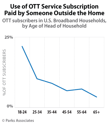 The Cost of Piracy finds 20% of OTT users aged 18-24 use an OTT video service paid by someone outside the home, the highest of any age group. Only 10% of OTT subscribers 25-34 admit to this behavior. Previous research, reported in the whitepaper “Uprising: College Students & Changing Video Preferences,” found that few respondents expressed guilt or embarrassment over using someone else’s video service credentials.