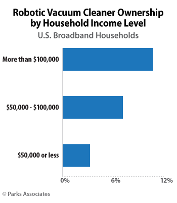 Countries that will be strong markets for robotic floor cleaners include Japan, the U.S., South Korea, and Germany. Consumer adoption will be most prevalent in high-income households. In the U.S., 11% of broadband households with an annual household income of more than $100,000 have a robotic vacuum cleaner, nearly double the national average.