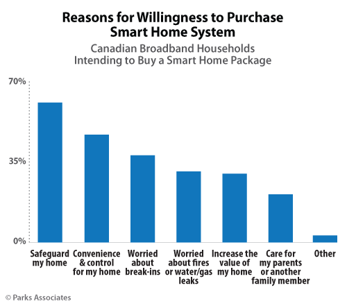 “The security channel is the early smart home leader in the U.S. and Canada, and the introduction of value-added services is expanding the market for both services and products,” said Tom Kerber, Director, Research, Home Controls & Energy, Parks Associates. “Even with low awareness of smart home solutions, 10% of Canadian broadband households are interested in getting home security services from their broadband service provider. Consumers are open to new connected concepts that allow service providers to generate new revenue and monetize their existing assets.”