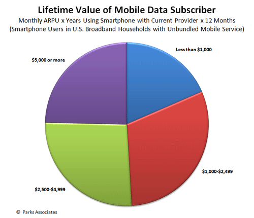 Parks Associates calculates the lifetime value of a mobile data subscriber by multiplying the length of time a subscriber has used a smartphone with his or her current provider by the monthly expenditure on mobile phone services.