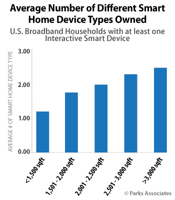 “Consumers with larger houses are also much more likely to own more than one type of smart home device,” said Tom Kerber, Director, Research, Home Controls & Energy, Parks Associates. “Households with 3,000 or more square feet own on average 2.5 different smart home products, while the average U.S. broadband household has less than two. As the middle market for smart home products expands, the custom installer channel has a key role to play in encouraging adoption by driving awareness and ensuring interoperability at the end-user level.”