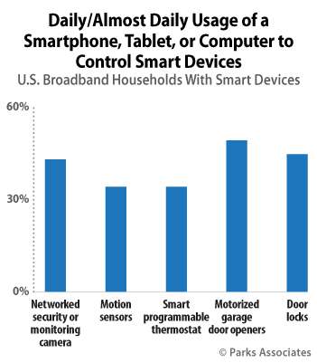 Parks Associates analysts say that mobile devices are becoming the de facto controllers for home automation, with apps as the critical interface between the user and the home. For example, nearly 50% of U.S. broadband households with a smart garage door opener use a smartphone, tablet, or computer to control the opener almost every day. The expansion of mobile device platforms to wearable form factors is creating many opportunities for developers to build services and applications for wearables in the smart watch space because of the extra convenience that wearables offer, particularly when voice-control APIs become more capable and intelligent.