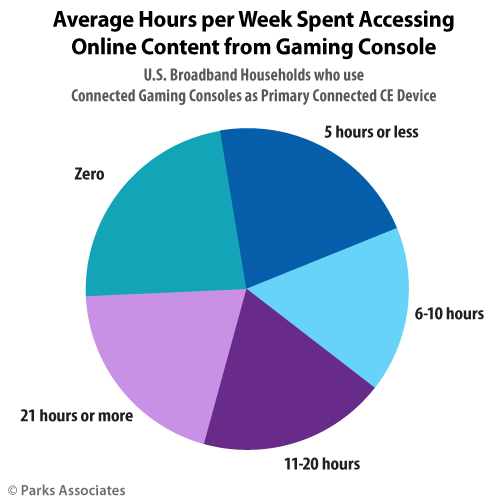 Parks Associates today announced new Consumer Analytics research,Connected Game Consoles, that shows 46% of U.S. broadband households have a game console connected to the Internet and over one-quarter (28%) use the connected gaming console as their primary connected CE device. Among these primary console users, roughly three-quarters use the gaming console to access non-gaming content online at least weekly, and nearly 40% access such content for more than 10 hours per week.