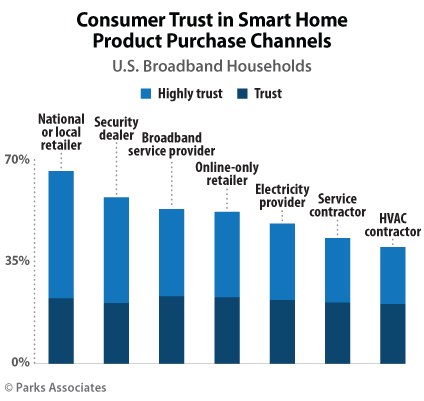 In a Parks Associates survey of consumer purchase preferences, consumers trust retailers over all other channels for smart home products, while security dealers are the second most trusted. Additionally, consumers’ channel preferences vary significantly by smart home product category. Of consumers planning to buy a smart home device, 24% of people shopping for networked security/monitoring cameras and 16% shopping for smart door locks would prefer to buy from a security dealer. By comparison, a retailer is the predominant channel for people looking to buy smart light bulbs and home/kitchen appliances.