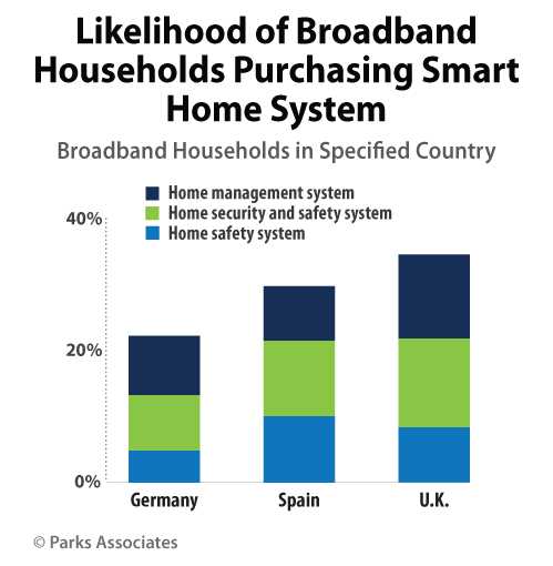 Parks Associates research shows that adoption of smart home services and devices is continuing to grow in Europe—already, 11% of broadband households in Spain, 9% in the U.K., 5% in Germany report ownership of a home control system. Interest, too, is growing, with 25% of broadband households in these three countries reporting that they are "very" interested in smart home devices, especially those for home security and safety.