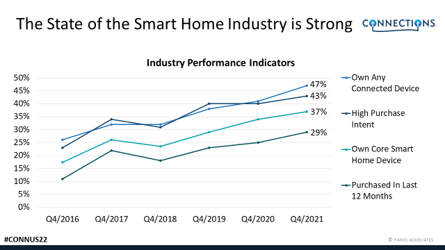 As of Q4 2021, Parks Associates consumer research shows 37% of internet households own a smart home device, a substantial increase from the end of 2018 when only 24% of U.S. broadband households reported owning one of the core smart home devices.