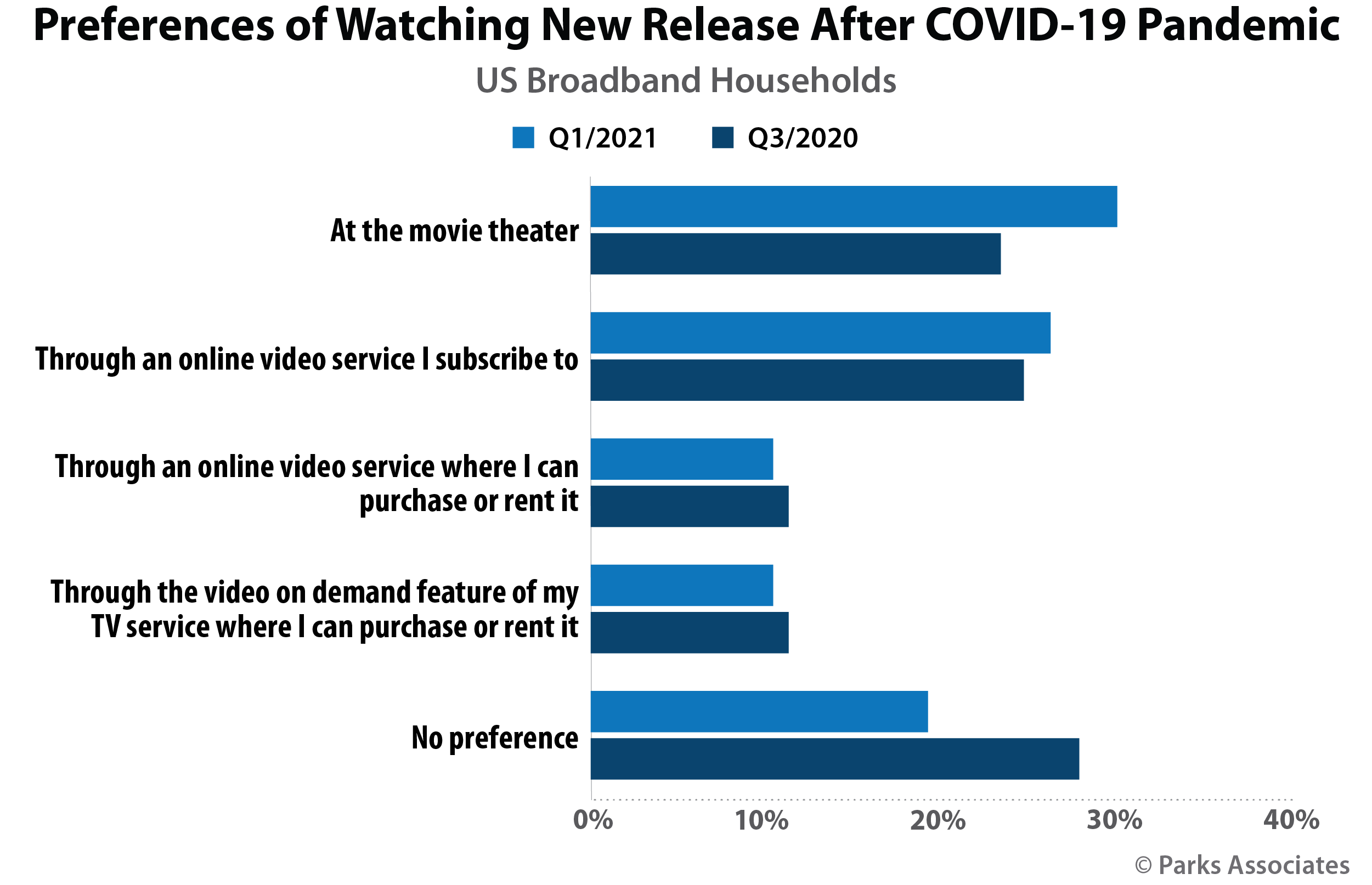 Data from Parks Associates indicates that while interest in watching new releases on transactional services has decreased, interest in watching new film theatrically and through subscription OTT services has risen. Thirty-two percent of households surveyed in Q1 2021 prefer to watch new releases in theaters, an increase of eight points since Q3 2020. Interest in subscription OTT services has increased by two points to 27 percent during this period.