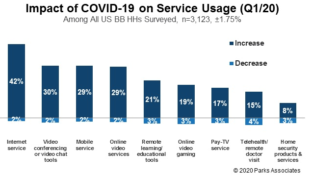 Internet service providers (ISPs) are in the midst of a significant sea change. ISPs must support the quickly evolving internet access demands across the globe brought on by the COVID-19 crisis. They are being called on to keep consumers and businesses connected, and are suspending data limits, waiving late fees, halting service termination, opening public Wi-Fi hots spots, and providing free broadband service among other measures to assist the public. From Parks Associates Q1 2020 survey, 42% of US broadband households report increasing their internet use at home due to COVID-19.