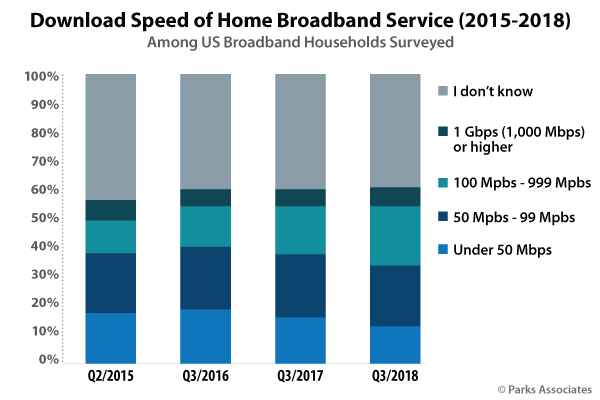 Parks Associates research shows that average service speeds among US broadband households have steadily increased over the last four years. The most dramatic shift has taken place in the 100 Mbps-999 Mbps tier; it almost doubled since mid-2015 as subscribers to lower-tiered services upgraded their plans.